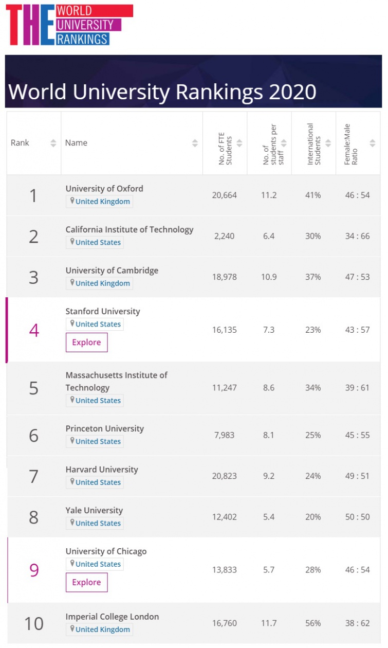 Всего в рейтинг 2020 года попали около 1400 учебных заведений со всего мира. Лидером рейтинга несколько лет подряд остается Оксфордский университет. На втором месте поднялся Калифорнийский технологический институт, на третьем – Кембридж.