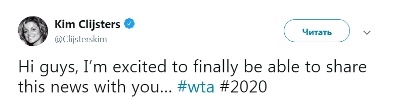 Экс-первая ракетка мира Ким Клейстерс намерена в январе 2020 года возобновить спортивную карьеру и начать играть на турнирах WTA. Об этом 3-летняя теннисистка сообщила в своем микроблоге Twitter.