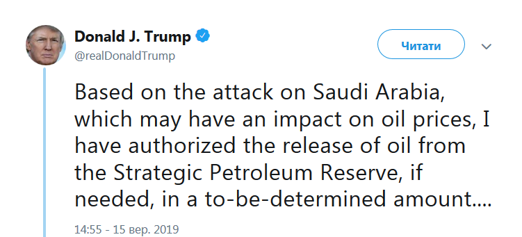 "В связи с нападением на Саудовскую Аравию, которое может оказать влияние на цен на нефть, я санкционировал выделение нефти из стратегического нефтяного резерва, если будет необходимость, в достаточном объеме для сдерживания рынка хорошо снабженным",- написал Трамп в своем Twitter.
