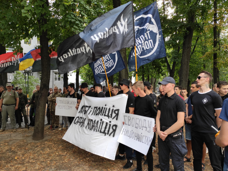 До ста представителей организаций "Фрайкор", "Традиции и порядок", "Правый сектор", "Национальный корпус", а также члены общественной организации "Харьковский областной союз ветеранов АТО" вышли на пикет к зданию главного управления полиции. Они держали в руках флаги Украины, символику своих организаций и плакаты: "ЛГБТ и полиция - одна коалиция", "Нет полицейским репрессиям", "Свободу националистам".
