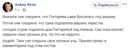 "Вначале они говорили, что Гонтарева сама бросилась под машину. Потом они говорили, что сама подпалила машину невестки. Сегодня утром подожгли дом Гонтаревой под Киевом. Они пока молчат, закрыли свои грязные рты. Но это не надолго.