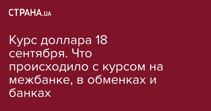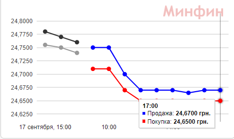 18 сентября НБУ снизил курс доллара на 1 копейку - до 24,76 грн. В обменках доллар вечером покупают за 24,65 грн, продают за 24,70 грн. Межбанк открылся с 10:00 и вечером показал такие котировки: 24,65 грн - покупка и 24,67 грн - продажа. В банках вечером доллар покупают от 24,50 до 24,72 грн и продают от 24,67 до 25,10 грн.
