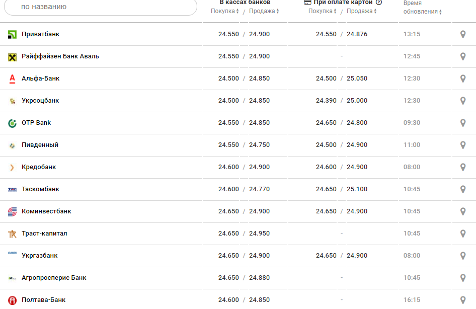 В банках курс доллара с утра и в обед такой: покупка от 24,50 до 24,72 грн и продажа от 24,75 до 25,20 грн. Вечером доллар покупают от 24,50 до 24,72 грн и продают от 24,67 до 25,10 грн.