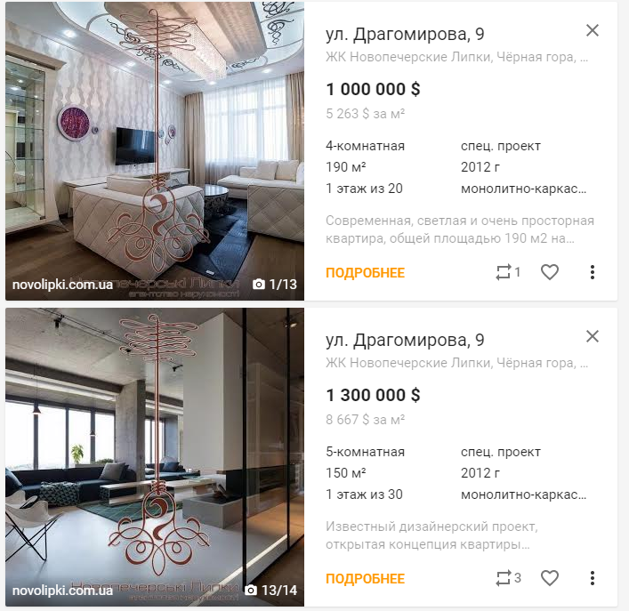 "Страна" узнала, что эта квартира находится в элитном жилом комплексе "Новопечерские Липки" на улице Драгомирова, 9. По сведениям одного из порталов о недвижимости, квартиры даже меньшей площадью продаются в этом здесь по ценам от 1 миллиона  долларов США: