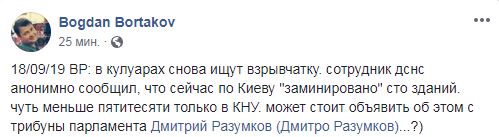 "В кулуарах снова ищут взрывчатку", - написал он. По его данным, сотрудник ГСЧС анонимно ему сообщил, что сейчас по Киеву "заминировано" сто зданий и "чуть меньше пятидесяти только в КНУ". Впрочем, что значит фраза "чуть меньше пятидесяти только в КНУ" журналист не пояснил.
