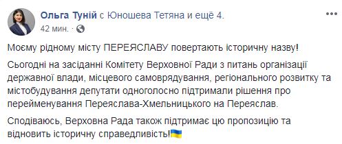 Сегодня на заседании Комитета Верховной Рады по вопросам организации государственной власти, местного самоуправления, регионального развития и градостроительства депутаты поддержали решение о переименовании Переяслава-Хмельницкого Переяслав. Об этом сообщила в Facebook Ольга Туний, пресс-секретарь главы партии "Слуга народа" Дмитрия Разумкова.