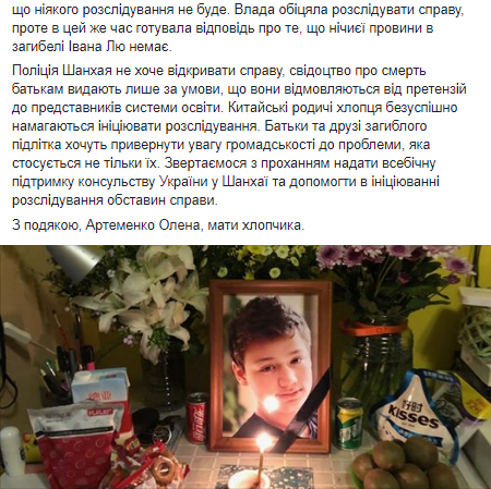 Мать погибшего подростка сообщает, что все материалы по делу у родителей есть, но в полиции Шанхая их не принимают. Власти Китая сначала ответили на ноту украинской стороны, которая была направлена после ее жалобы. Но уже 12 сентября в Бюро общественной безопасности в отделе для иностранцев родственникам умершего пытались передать документы о том, что никакого расследования не будет.