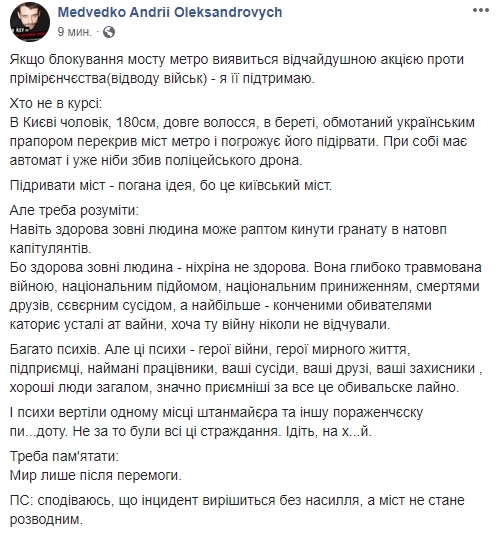 В соцсетях уже обсуждают причину, по которой подрывник Белько захватил мост. Так, подозреваемый в убийстве Олеся Бузины националист Андрей Медведько предположил, что террорист мог выйти на мост, чтобы выразить протест против разведения войск на Донбассе. И в таком случае Медведько заявил о готовности его поддержать.