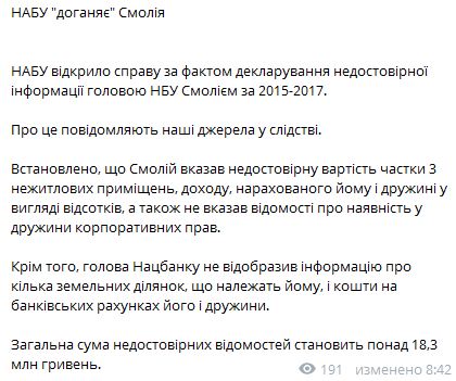 "НАБУ открыло дело по факту декларирования недостоверной информации главой НБУ Смолием за 2015-2017 года", - утвержают информаторы из следствия.