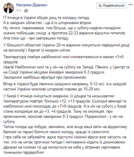 "Ну, ничего, переживем, тем более, что в субботу-воскресенье-понедельник будет значительно больше солнца, а в течение 22-23 сентября ощутимо потеплеет... Теплая погода еще побудет, конечно, но если ваши цветы на открытом балконе или террасе боятся такого холода, лучше их защитить. И о себе не забывайте, ведь коварные сезонные вирусы уже подстерегают тех, кто не читает прогнозы погоды и легкомысленно ходит с джинсовыми дырками на коленях и еще любуется на себя в витринах в августовским тоненьком гардеробе", - написала Наталья Диденко.