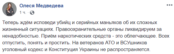 "Теперь ждем исповеди убийц и серийных маньяков об их сложных жизненный ситуациях. Правоохранительные органы ликвидируем за ненадобностью. Приём наркотических средств - это облегчающее. Всех отпустить, понять и простить. На ветеранов АТО и ВСУшников уголовный кодекс и Конституция Украины не распространяется", - возмущена журналистка "Страны" Олеся Медведева.