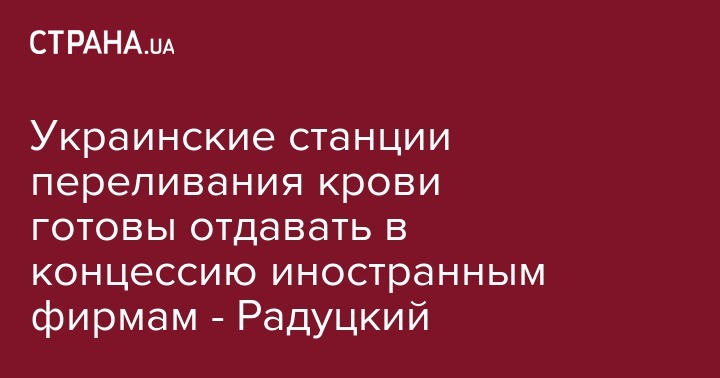 "Концессия - это то, что позволит решить проблемы с заготовкой крови и вообще со станциями переливания крови в Украине и впустит инвесторов в Украину. Сегодня Украина готова отдавать в концессию станции переливания крови, чтобы зашел инвестор и взял это в управление", - сказал Радуцкий .