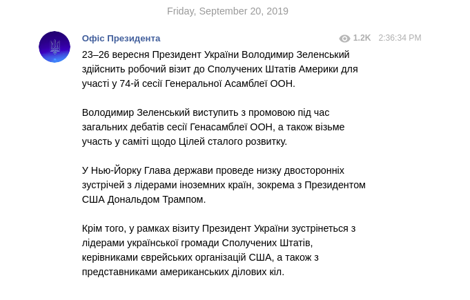 23-26 сентября президент Украины Владимир Зеленский с рабочим визитом посетит Соединенные Штаты Америки для участия в 74-й сессии Генеральной Ассамблеи ООН. Об этом сообщает Офис президента в Telegram.