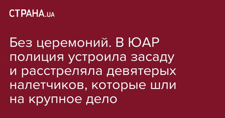 Вчера, 22 сентября, в ЮАР прошла громкая полицейская операция, которая завершилась ликвидацией девяти налетчиков, планировавших ограбить бизнес-центр и взломать там сейфы с деньгами. Но бандиты угодили в полицейскую засаду, как передает агентство Синьхуа.