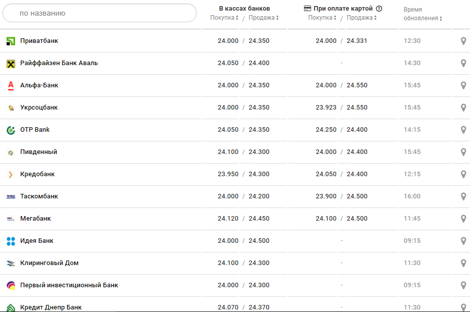 В банках курс доллара с утра был такой: покупка от 24,10 до 24,38 грн и продажа от 24,32 до 25,90 грн. В обед доллар покупают от 23,90 до 24,20 грн и продают от 24,14 до 24,90 грн.