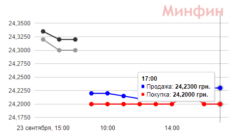 24 сентября НБУ снизил курс доллара на 11 копеек по сравнению со вчерашним днем - до 24,32 грн. В обменках доллар вечером покупают за 24,10 грн, продают за 24,17 грн. Межбанк открылся с 10:00 и закрылся такими котировками: 24,20 грн - покупка и 24,23 грн - продажа.