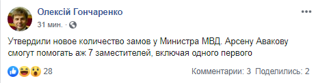 Также Гончаренко сообщил, что правительство утвердило новое количество заместителей Арсена Авакова - их теперь будет 7, включая одного первого.