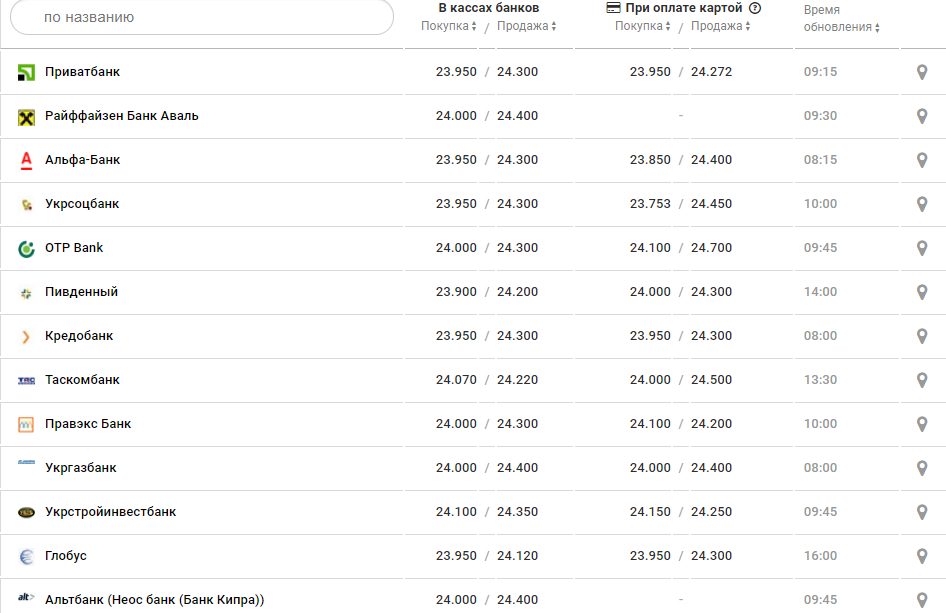 В банках курс доллара с утра был такой: покупка от 23,80 до 24,13 грн и продажа - от 24,15 до 24,90 грн.