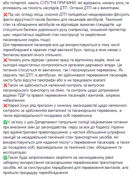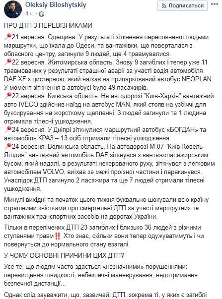 После двух жутких ДТП с участием пассажирских автобусов и грузовиков, в каждом из которых погибли по 9 человек, Департамент патрульной полиции Украины инициирует ужесточение правил пассажирских перевозок. Об этом сообщил первый заместитель начальника патрульной полиции Алексей Белошицкий на своей странице в Facebook.