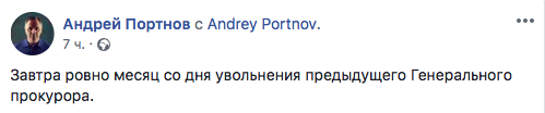 "Завтра ровно месяц со дня увольнения предыдущего Генерального прокурора..." - написал известный юрист Андрей Портнов.