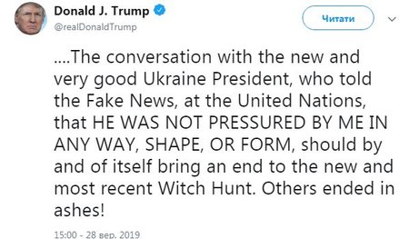 "Разговор с новым и очень хорошим президентом Украины, который рассказал "Фейковым Новостям" в ООН, что он не подвергался какому-либо давлению с моей стороны, в той или иной форме, должен сам по себе положить конец последней "охоте на ведьм". Остальные уже превратились в прах", - сказано в сообщении.