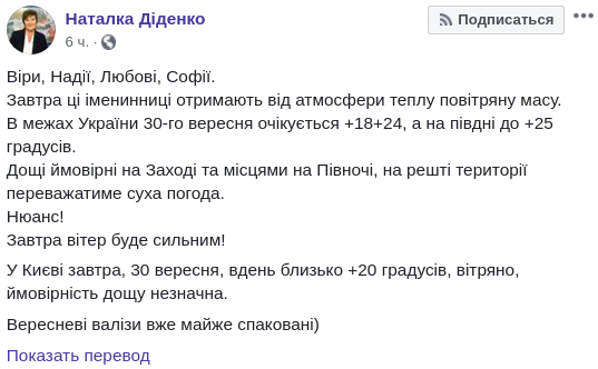 Синоптик Наталья Диденко рассказала, что в понедельник, 30 сентября, в Украине будет тепло. Об этом она рассказала на своей странице в Facebook.