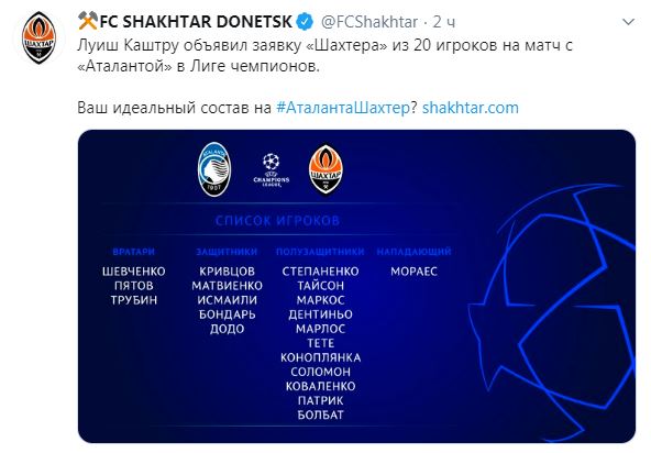 Во вторник, 1-го октября, донецкий "Шахтер" в рамках Лиги чемпионов на выезде померяется силами в игре против Аталанты. Главный тренер "горняков" Луиш Каштру взял на игру 20 футболистов, пишет клуб в Twitter.