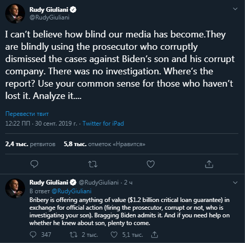По мнению адвоката Трампа, Байден причастен к взяточничеству. Джулиани отметил, что речь о предложении займа в $1,2 млрд, "в обмен на официальные действия (увольнение прокурора, коррумпированного или нет, который расследует дело вашего сына)".