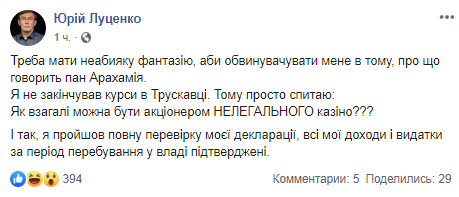 "Надо иметь большую фантазию, чтобы обвинять меня в том, о чем говорит господин Арахамия. Я не заканчивал курсы в Трускавце. Поэтому просто спрошу: Как вообще можно быть акционером нелегального казино?" - написал Луценко.