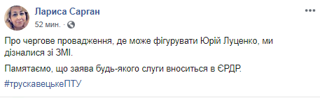 Пресс-секретарь Луценко Лариса Сарган в Facebook сообщила, что об "очередном производстве, где может фигурировать Юрий Луценко" узнала из СМИ.