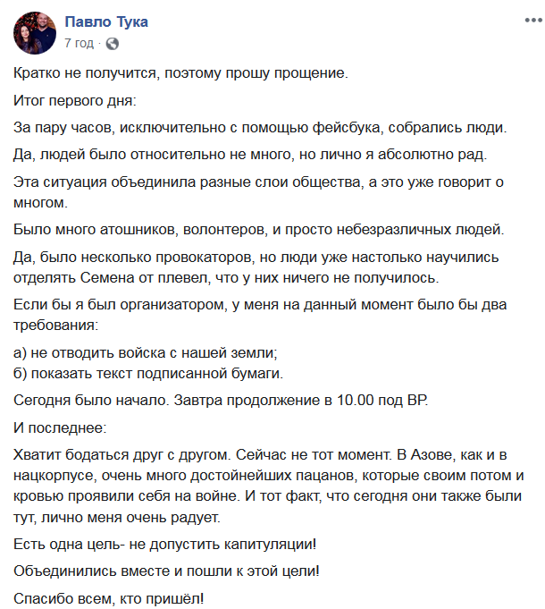 И последнее: хватит бодаться друг с другом. Сейчас не тот момент. В Азове, как и в Нацкорпусе, очень много достойнейших пацанов, которые своим потом и кровью проявили себя на войне. И тот факт, что сегодня они также были тут, лично меня очень радует. Есть одна цель - не допустить капитуляции!", - написал Павел Тука.