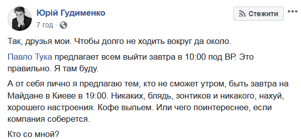 "Так, друзья мои. Чтобы долго не ходить вокруг да около. Павло Тука предлагает всем выйти завтра в 10:00 под ВР. Это правильно. Я там буду. А от себя лично я предлагаю тем, кто не сможет утром, быть завтра на Майдане в Киеве в 19:00. Никаких, бл@дь, зонтиков и никакого, нах@й, хорошего настроения. Кофе выпьем. Или чего поинтереснее, если компания соберется? - написал Юрий Гудименко.
