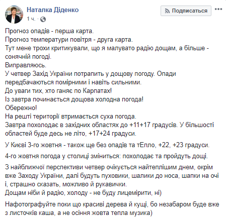 "В ближайшей перспективе четверг будет самым теплым днем, кроме запада Украины, дальше будут пуховики, шарфы к носу, шапки на глаза и, страшно сказать, возможно, и перчатки. Дождям будто и радуюсь, холоду - не буду лицемерить - нет. Нафотографуйте пока красивые деревья и кусты, потому что вскоре будет уже из листочков каша, а не осенняя желтая теплая музыка", - написала Диденко.