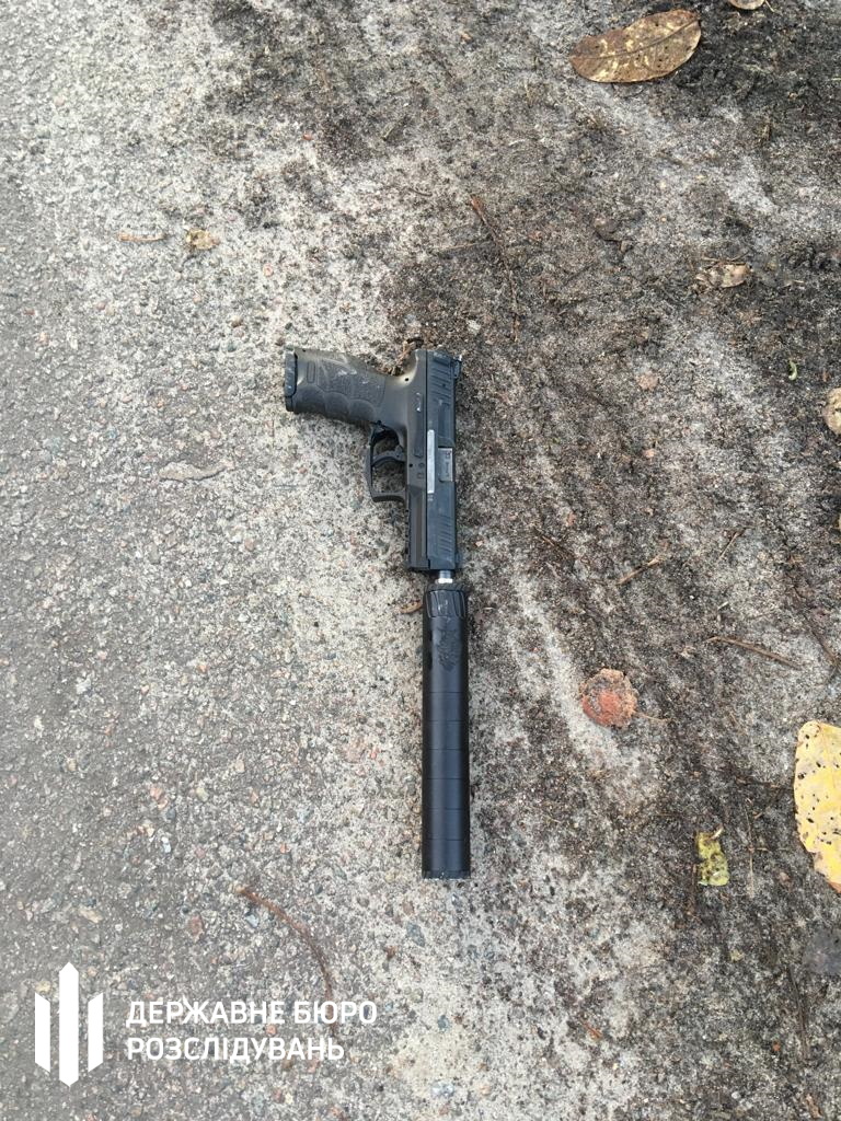 Судя по фото с места инцидента, злоумышленник стрелял в полицейского из пистолета с глушителем.