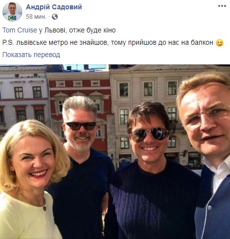 "Том Круз во Львове, значит, будет кино. P.S. Львовское метро не нашел, поэтому пришел к нам на балкон", - написал Садовой на своей странице в Facebook.