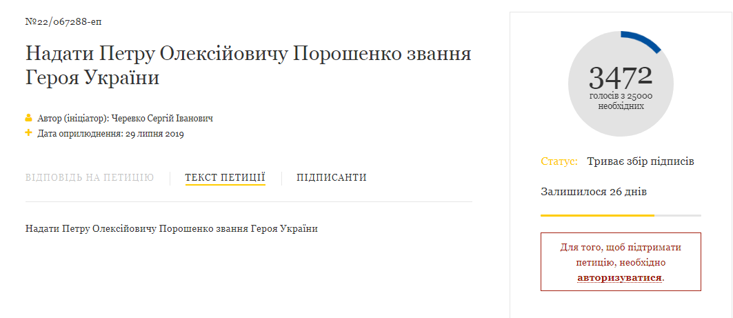 Автор такого предложения - Сергей Иванович Черевко. Петицию №22/067288-еп о том, что Порошенко надо наградить званием, он разместил 29 июля. С тех пор ее подписали 3472 человека.
