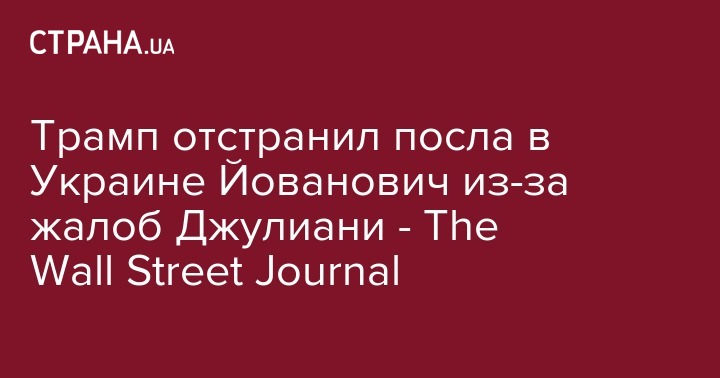 Президент Трамп распорядился отстранить посла Мари Йованович от должности посла США в Украине после жалоб его личного адвоката Руди Джулиани и других лиц. Об этом сообщает The Wall Street Journal.