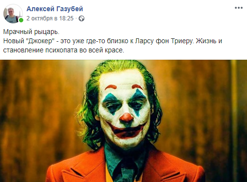 "Мрачный рыцарь. Новый "Джокер" - это уже где-то близко к Ларсу фон Триеру. Жизнь и становление психопата во всей красе" - написал Алексей Газубей.