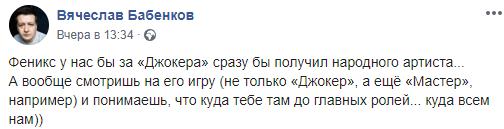 А вообще смотришь на его игру (не только "Джокер", а ещё "Мастер", например) и понимаешь, что куда тебе там до главных ролей... куда всем нам" - написал Вячеслав Бабенков.