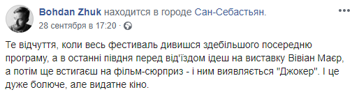 "То чувство, когда весь фестиваль смотришь основном посредственную программу, а в последние юга перед отъездом идешь на выставку Вивиан Майер, а затем еще успеваешь на фильм-сюрприз - и им оказывается "Джокер". И это очень болезненно, но выдающееся кино" - написал Богдан Жук.