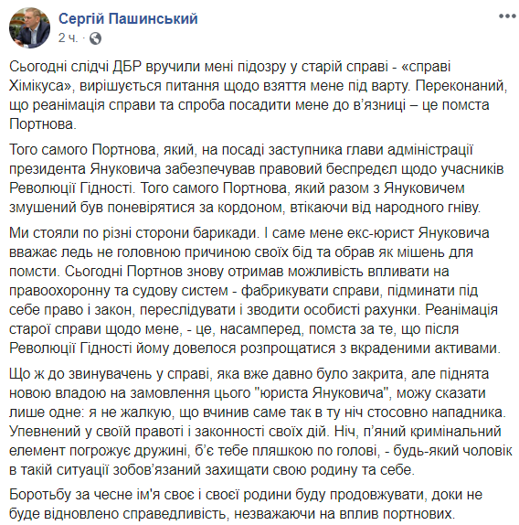 "Сегодня следователи ГБР вручили мне подозрение по старому делу - "делу Химикуса", решается вопрос о взятии меня под стражу. Убежден, что реанимация дела и попытка посадить меня в тюрьму – это месть Портнова. Того самого Портнова, который на посту заместителя главы администрации президента Януковича обеспечивал правовой беспредел в отношении участников Революции достоинства. Того самого Портнова, который вместе с Януковичем вынужден был скитаться за границей, скрываясь от народного гнева", - подчеркнул он.