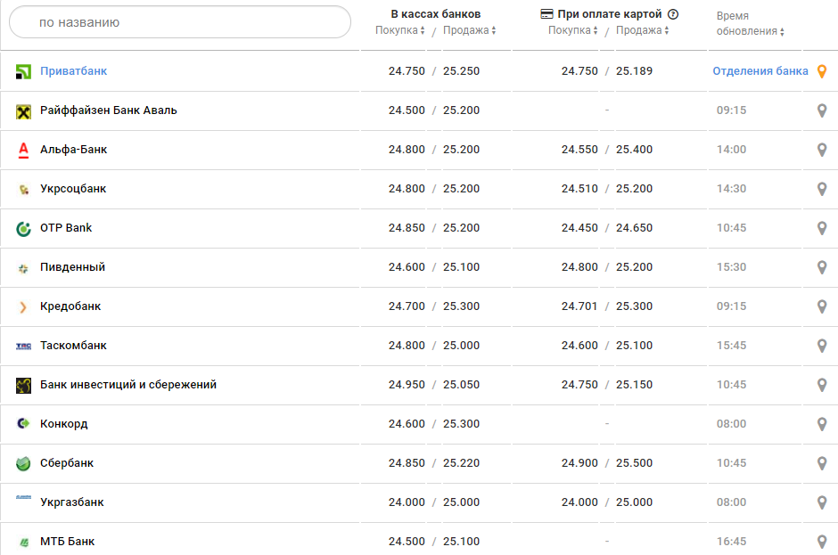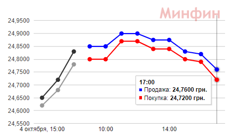В банках курс доллара с утра был такой: покупка от 24,45 до 24,75 грн, продажа от 24,95 до 25,25 грн.