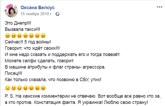 "Вызвала такси!!! Сейчас!! 5 год войны! Говорит, что ждет своих!!! И мне надо сказать и поддержать его и тогда повезет. Можете селфи сделать, говорит. В машине атрибуты и флаг страны-агрессора. Писец!!! Как только сказала, что позвоню в СБУ, утих!" - сказано в посте Белоус.