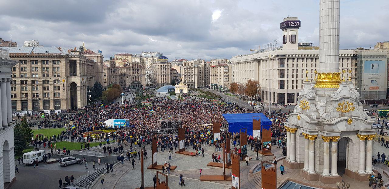 Среди собравшихся - одинаковое количество молодых людей и пенсионеров, есть люди в камуфляжной форме, а также представители "Нацкорпуса". Под стелой на Майдане установлена сцена с надписью "Рух опору капiтуляцiї".