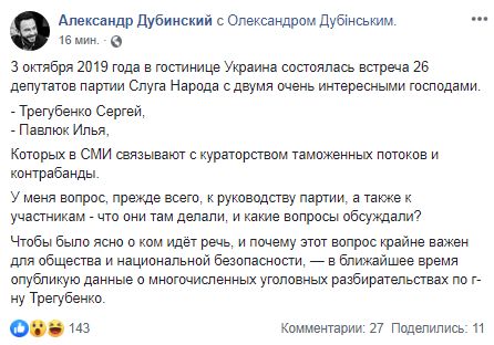 По его словам, встреча проходила в гостинице "Украина", в ней принимали участие 26 депутатов от "Слуги Народа". Дубинский отметил, что Трегубенко и Павлюка в СМИ связывают с кураторством таможенных потоков и контрабанды.
