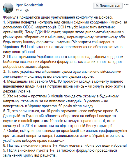 Кондратюк пишет, что жителям неподконтрольной части Донбасса в течение месяца с момента полного восстановления власти Киева нужно будет определиться - хотят ли они жить в государстве Украина.