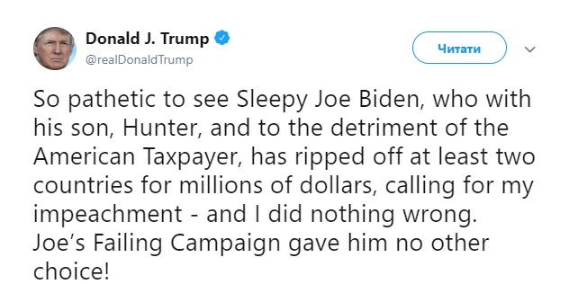 Президент США Дональд Трамп прокомментировал заявление своего будущего оппонента на президентских выборах Джо Байдена, который призвал к его импичменту. Об этом он написал в своем Твиттер-аккаунте.