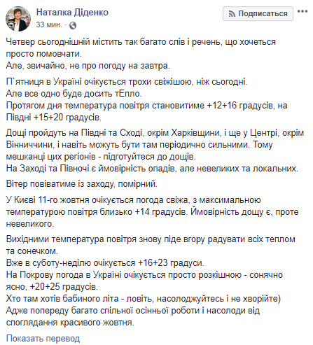 "На выходных температура воздуха снова поднимется вверх и будет радовать всех теплом и солнышком. Уже в субботу-воскресенье ожидается +16...+23 градуса. На Покрову погода в Украине ожидается просто роскошной - солнечно, ясно, +20...+25 градусов. Кто там хотел бабьего лета - ловите, наслаждайтесь и не болейте. Ведь впереди много совместной осенней работы и удовольствие от созерцания красивого октября", - написала Наталья Диденко.