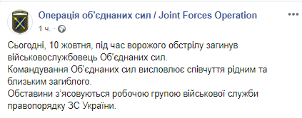 "Сегодня, 10 октября, во время вражеского обстрела погиб военнослужащий Объединенных сил. Командование Объединенных сил выражает соболезнования родным и близким погибшего", - говорится в сообщении.