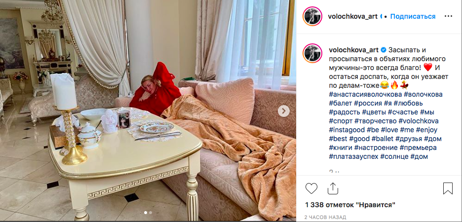 "Засыпать и просыпаться в объятиях любимого мужчины-это всегда благо! И остаться доспать, когда он уезжает по делам - тоже", - написал Волочкова в своем Инстаграм и прикрепила два фото.